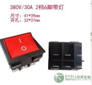 求购电源开关 380V/30A 2档 6脚 红色 带灯