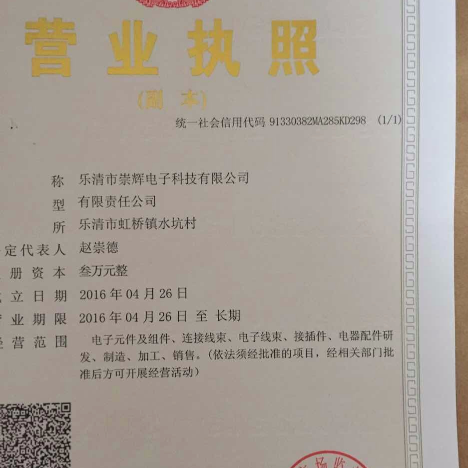 乐清市崇辉电子科技有限公司我司专业生产加工各类线束,连接器,元器件。