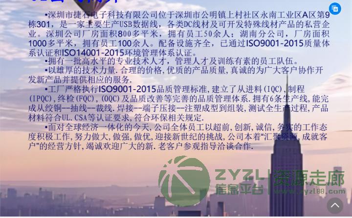 公司主要生产各类USB数据线,深圳公司50余人,湖南工厂100余人,各类配备设施齐全。已通过ⅠSO9001-2015质量体系认证及lSO14001-2015环境体系认证。