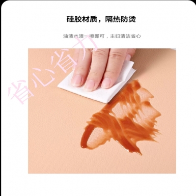 硅胶餐垫·六大亮点:不沾桌面·防滑·防水防油·清洗简单·隔热防烫·多色可选;硅胶材质手感舒适可与食物