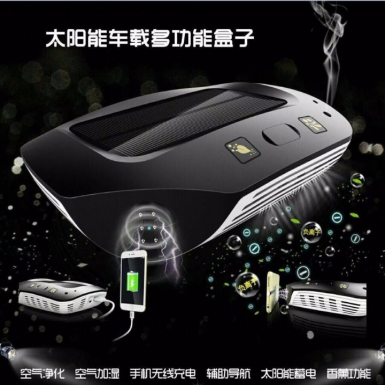 产品集成空气净化、空气加湿、空气香薰功能、手机无线充电、手机磁吸支架辅助导航、太阳能蓄电、副驾驶位手机USB充电多功能于一身,是一款多功能使用的车载盒子,内置高