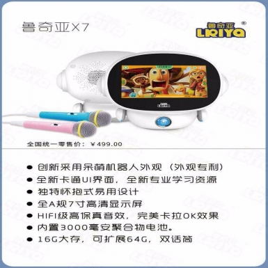 创新呆萌机器人外观;卡通UI界面;专业学习资料,可更新;16G大内存;7寸高清屏,完美K歌效果,双话筒;主要用于3~10岁孩子的早教、学习、娱乐等,防震防摔,安