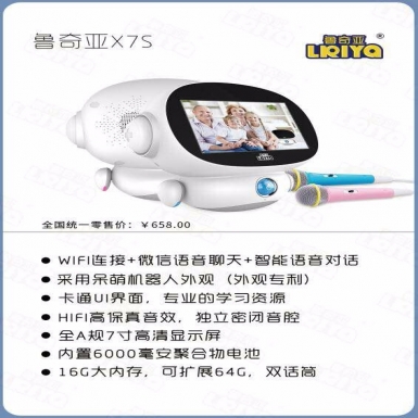 创新呆萌机器人外观;卡通UI界面;专业学习资料,可更新;16G大内存;7寸高清屏,完美K歌效果,双话筒;wifi连接,微信语音聊天,智能语音对话;主要用于3~1
