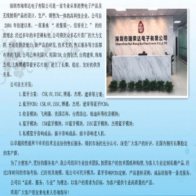 深圳市瑞荣达电子有限公司是-家专业从事消费电子产品及无线射频产品、蓝牙pcba方案、蓝牙模块方案、蓝牙5.0