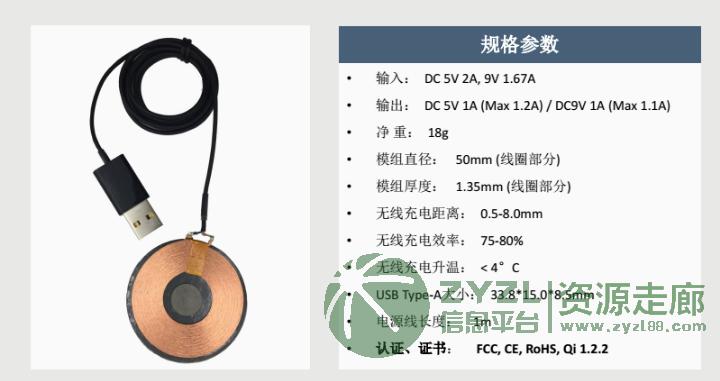 本产品实现全球最低温(<4°C)的充电技术,为手机用户提供更安全的充电体验。利用受专利保护的PCBA与线圈分离法,将PCBA转移到USB-A接头,由1米的定制电缆与线圈连接而成。实现高效充电的同时,只有13%的发射器热量传递给手机。