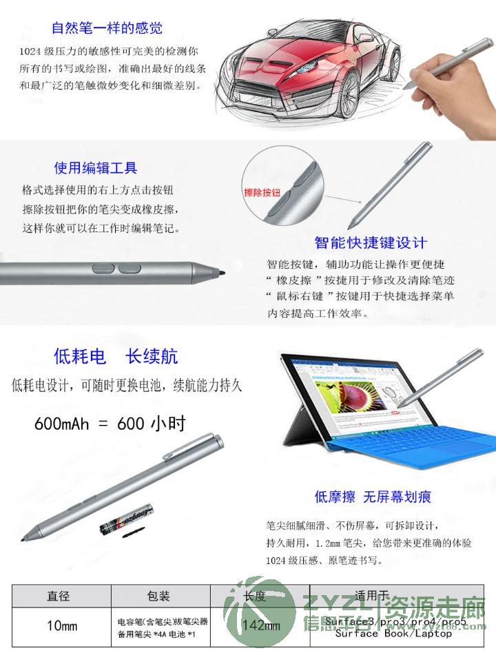 流畅自然手写体验;任何角度均无比精准;顺畅无比的线条及孤线;两颗颗按钮採挂勾式设计,提供橡皮檫及右键点选功能;电池续航能力强。适于用微软surface3,pro3,pro4。