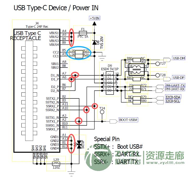 24P的插座,自带两个CC下地电阻,按照上图引出7芯(电源、地、5个信号)