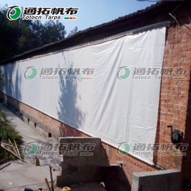 猪场卷帘布从半成品到产品经过:织布~涂塑~烘干~开料~热合~裁剪~车边~打孔~打包等工序精制而成。通拓防水篷