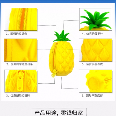 产品:硅胶菠萝零钱包 功能:硅胶菠萝零钱包功能广泛多样,不仅仅可以存储纸质零钱、铁币,还能够用来存放耳机、钥匙、戒指等小物件、小饰品。