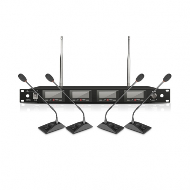 WCT804高端会议系统通道数:四通道面板显示:镜面OLED屏可同时显示发射器编号,RF/AF信号强度,SQ设置,发