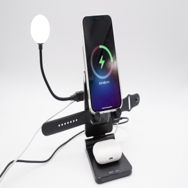 最近深圳市诚瑞科技推出了一款四合一无线充电支架,同时集成了手机、蓝牙耳机无线充电板以及手表无线充电器