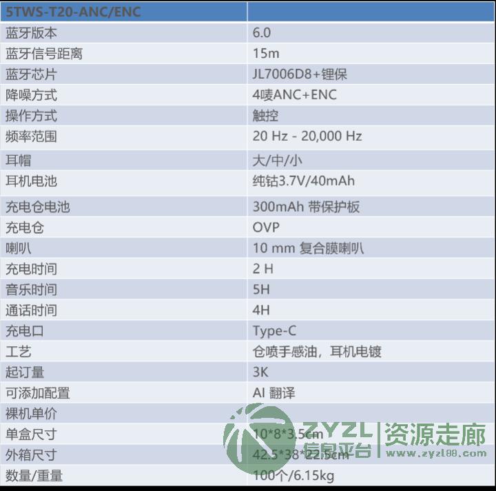 推荐一款very nice蓝牙耳机TWS-T20-ANC/ENC,蓝牙版本6.0,芯片采用JL7006F8+锂保,4唛ANC+ENC智能降噪,智能触控,Type-C充电口,硅咪/陶瓷天线,频率范围20 Hz - 20,000 Hz,10 mm 复合膜喇叭,仓喷手感油,耳机电镀工艺,音乐播放时间长达5H,可添加AI 翻译,请参考详细资料图片。欢迎来电咨询,价格不高,两位数3+[抱拳]无ANC的价格2+[悠闲]